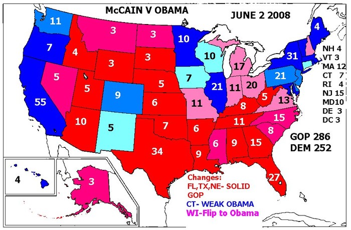 As per the Election Weatherman's forecast as of June 2nd 2008, The Republicans can look forward to having their man in the White House next year.  BTW, this can change ala the Clinton lead before the Democratic Primaries: