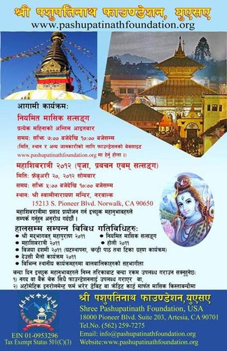We would like to invite you on “MAHASIVARATRI-2012” at the following location and date. There will be Puja, Prawachan/Satsang, Bhajan and Prasad distribution.