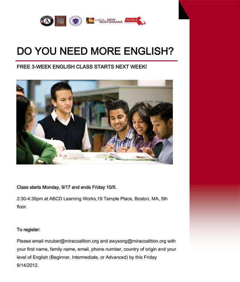 There's a great opportunity to learn English with our 2012-2013 MA AmeriCorps New Americans Integration Program Members. They are preparing to serve the community with a five-week training on teaching ESOL and they need practice teaching time!