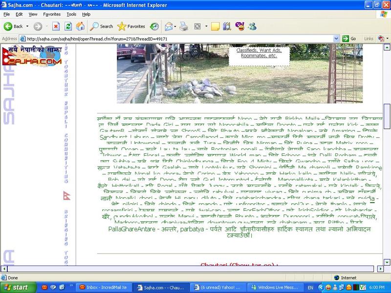 Meet the world's finest school teacher, unbeatable students, mischievous senior citizens, wildest dreamers, vacationing revolutionaries, rethinking moderates, instant poets, gifted story-tellers, pot smokers, alcoholics, workoholics, home-makers, pretty damsels, fierce contenders, homelanders, laa-hoo- rays, all on the stage of Chautari of Sajhaland. .गोताएँदाइकोब्लग - कफी विथ कुम्ले कार्यक्रम दोस्रो भागमा ठूली, तितौरी र सान्नानीको अन्तर्वार्ता, अरू आउने क्रममा - क्लोज-अप - चौतारी तारारामपम प्रायोजकको अभावमा स्थगित - चौतारीमा बिभिन्न किसिमका समाचार प्रसारण सुरु - भउतेद्वारा सुध्रिने घोषणा, हरेकको जिस्काई/थर्काईका बाबजुद सुध्रिछाड्ने प्रतिबद्धता ठुल्दाइको कविता/सविता/रमिता यो माया पाप हो भने, ******************* यो माया पाप हो भने, तिमी अग्नि भएर उठ म त्यही तापमा जलिदिन्छु। यो माया श्राप हो भने तिमी बानी भएर जाग म चुपचाप सहिदिन्छु। यदि यो माया पाप होइन भने यो माया श्राप होइन भने कुनै करकाप होइन भने आउ निस्पाप अंगालो लिएर, चोखो म्वाइ मा बांधिएर जन्म जन्मान्तर् सम्म एक अर्कामै सम्माहित् भएर तिमी खाली सिउंदो फर्काएर म मायाको छाप भर्दिने छु मायाको अमर मिलाप लेखिदिने छु।