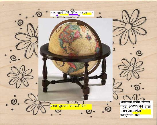 मास्टरनी नानी, चित्रेजीको नाम मिलाई पुरस्कार हात पर्नु भएकोमा बधाई छ है। अब दादाको नाम मिलाको पुरस्कार चाँही मेरै भो हैन त? अनि मेरो नामको पनि hint दिउँ है त । PDUAEVDN चित्रेजी, सन्त प्याट्रीकको दिनको जुलुस जानु भो त? गिनेस कति मानो चढाइयो नि?