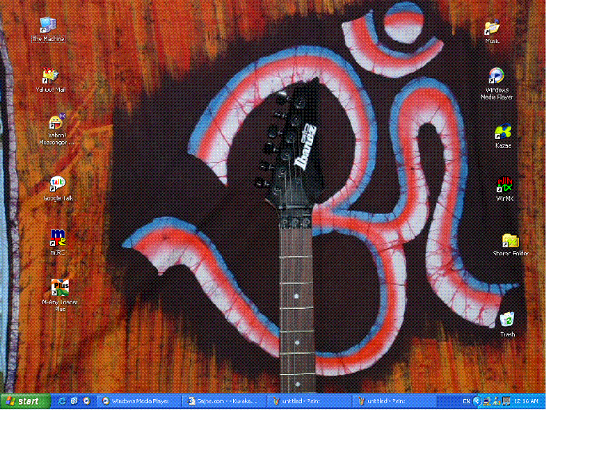 Matrixrose, do i see an icon on yours that says GSPOT? LOL, whatchu upto girl? and mahissasur, to get your desktop, make sure all windows are minimized, then hit shift+printscreen. its one of those 3 buttons that come after F12 key. then go to paint, or photoshop, paste the pic and make sure you resize it. to resize on paint, click IMAGE, then click stretch/skew and enter the percent size you want to decrease. after that make sure, you reduce the white box from the lower left corner to the size of your pic, or else your pic will look small but take huge space on this page, for ex. your pic is gon look like badarnikt's. pic is there but big white box is taking most part! GOODLUCK :P