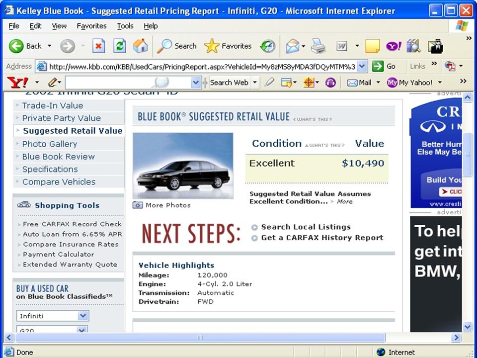 dude, KBB value for infinity is click here or for cut and paste http://www.kbb.com/KBB/UsedCars/PricingReport.aspx?ManufacturerId=21&YearId=2002&VehicleClass=UsedCar&VehicleId=My8zMC8yMDA3fDQyMTM%3d&PriceType=Private+Party&ModelId=387&Mileage=120000&SelectionHistory=4213%7c3170%7c10601%7c0%7c0%7c&Condition=Excellent&QuizConditions=0 its listed @ 6740 and that's also for private party value for excellent. check the trade in will be couple of grands less. usually car from private party is not in excellent condition unless its a single owner car (O: preety high mileage 120K for 5 year or roughly 6 year old car.
