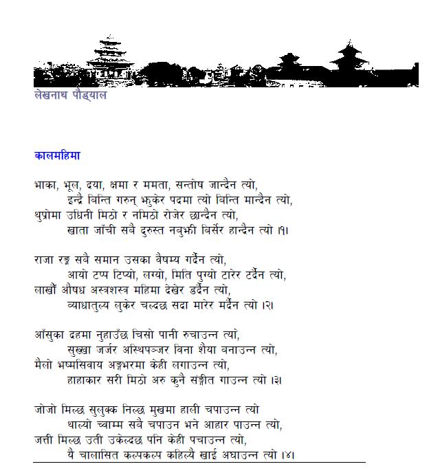 काल महिमाको कुरा आइको थियो के रे; ल यहाँ छ। http://www.nepalikavita.com/utkrista-kavita/KaalMahimabyLekhnathPaudyal.pdf