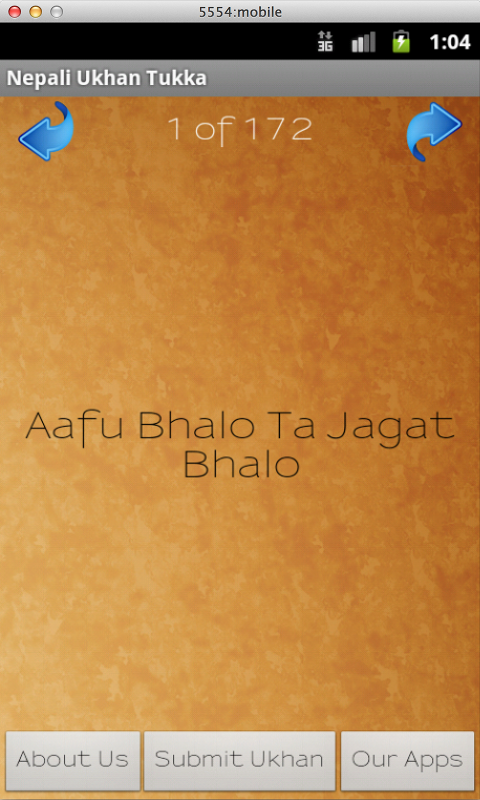 Just released a very simple Android app with 172 Nepali Ukhan Tukkas. Either use left and right arrow to navigate sequentially or just shake your phone to get a random Ukhan Tukka. [ App Details | Google Market Link]. I am working on a thumb swipe, which I plan to release as an update.