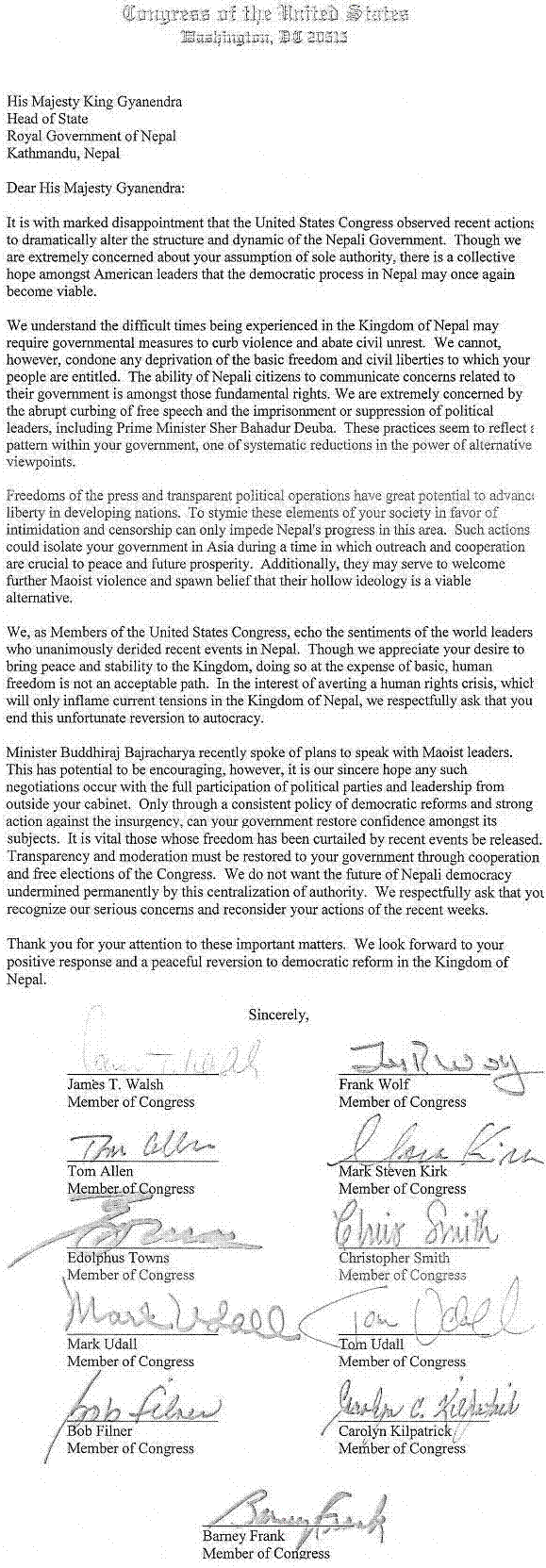 Above letter was given to the Nepalese Ambassador for the United States on April 12, 2005 by NY Congressman James T. Walsh in a meeting. Congressman has asked Ambassador to deliver that letter to King. Since this letter is out, I would like to share another letter circulated by the Delegation that went to Capitol Hill on March 11: