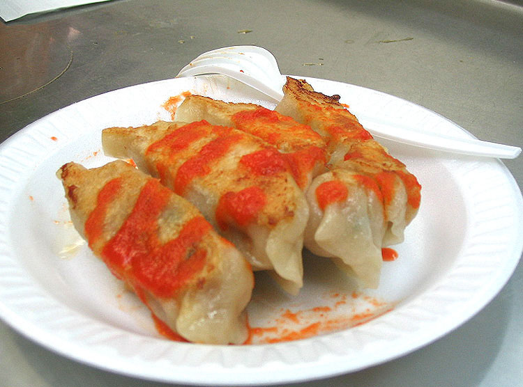 although exactly not the nepali momo, there is this place in Chinatown that sells fried dumplings for dirt cheap. the shop is on Mosco Street (between Mott and Mulberry Street). it has a sign saying 'fried dumplings' and you get 5 for $1. and they taste awesome! dont forget the hot sauce as well.