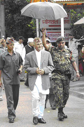 Oli should've treated better to the sholder holding the umbrela. Technically, Oli should be holding the umbrella and not the other way around. Because, Oli is civil servant, and the sholder is risking his life to defend the country while Oli is busy biting fried chicken in D.C..... I don't see the difference between Rana regime and the Oli and Co. regime. .. they both are using sholders to hold chatas and robbing the country... shame to all the Nepali for chosing such leaders...