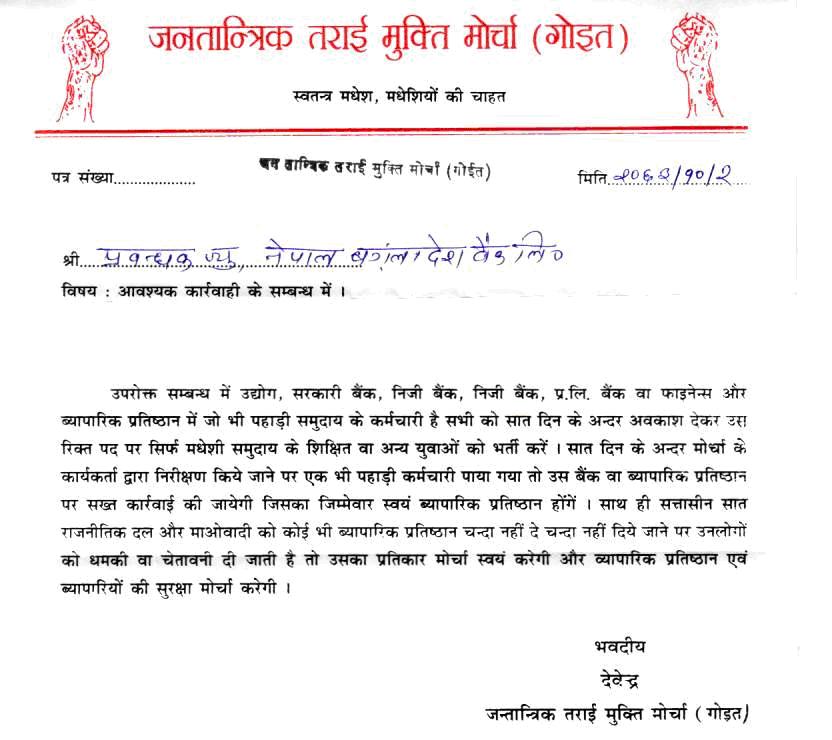 muji timiharu ko yahi madheshi discriminatory baani le garda aaj maile pani New Nation ko demand garchhu. Pahila ta Madehsi haru nai pagal chhan bhaner sochte, tar aba. everything is open book. Now Nepalese have shown their true blood. Were trying to be diplomatic, but now they are all on to Madeshi.... Thanks guys for waking me up... Lets see now....