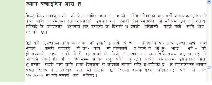 I think first we need photographs of "Bhuwan" and few copies of medical reports. I sent an email to nepalnews so that I can get info. If I did not get any info by tomorrow I will call nepal on that ph no. By then, San can you post link and make paypal donation account for him. Saan Dai