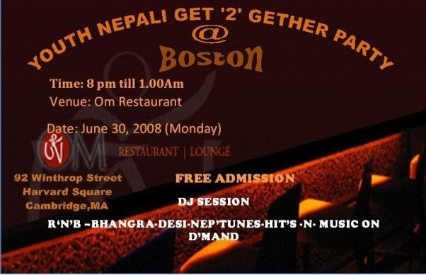 We nepali friend from Boston  are organizing a nepali get together Party @ Om restaurant  in Harvard Square , Boston on June 30 2008 ( Monday ). So Friend come join us and lets Rock the Party.