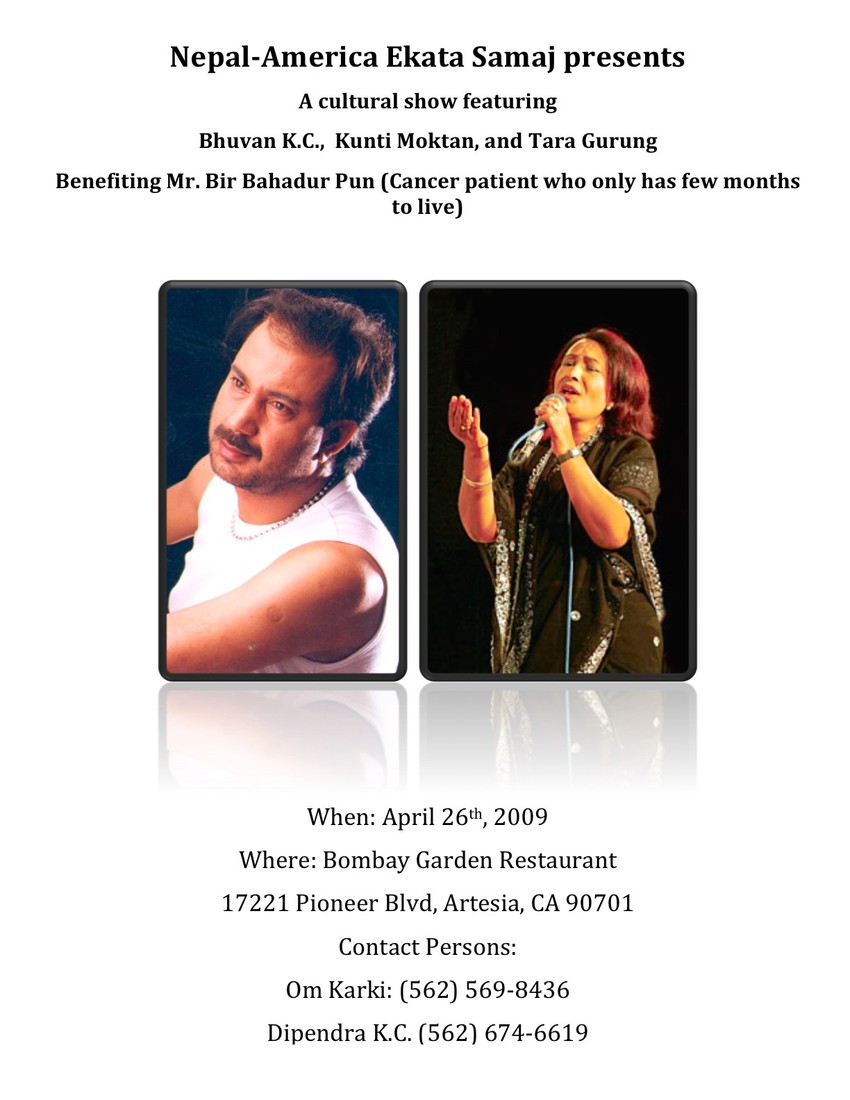 Nepal-America Ekata Samaj presents A cultural show featuring Bhuvan K.C., Kunti Moktan, and Tara Gurung Benefiting Mr. Bir Bahadur Pun (Cancer patient who only has few months to live)