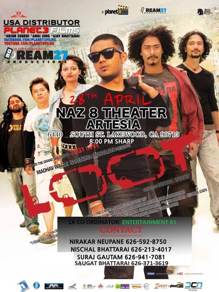 We would like to welcome you all to attend the screening of the Nepali Blockbuster Movie "Loot" at Naz 8 Cinemas Artesia on 28th April. Tickets are already available..(15$ per person).. A must watch movie that brought an earthquake in the Nepali Entertainment Industry. Once Again Welcome you all in the event..