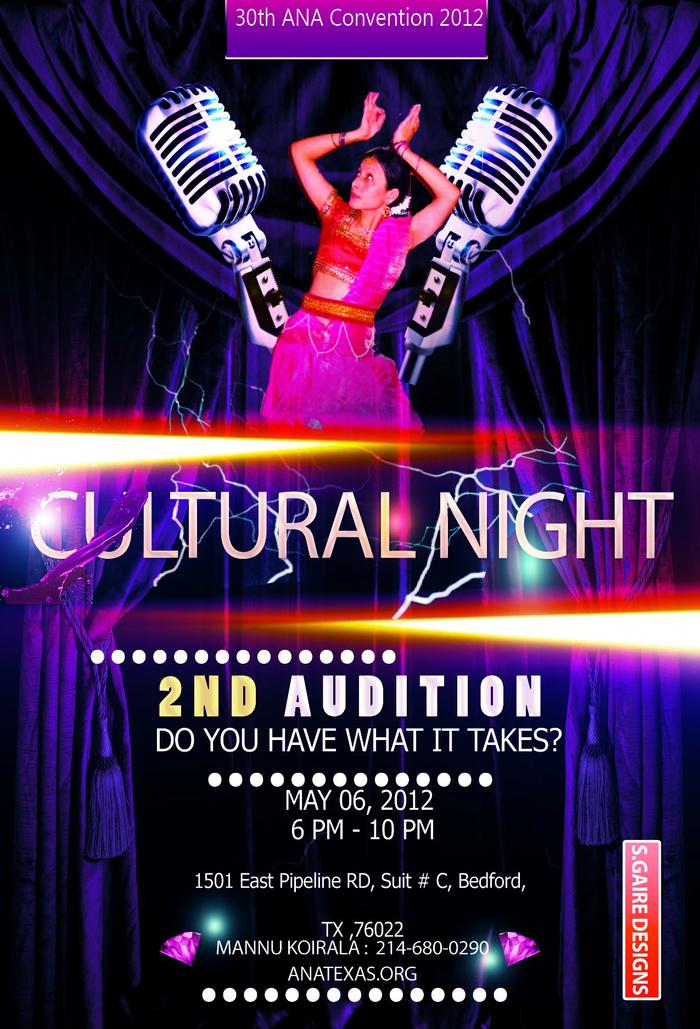Date for Audition: May 06, 2012 Time : 6 pm – 10 pm Venue for Audition: D & S Food Mart (1501 East Pipeline RD, Suit # C, Bedford, TX 76022) More information about the convention and the events will be updated on http://anatexas.org/index.php as they get finalized.