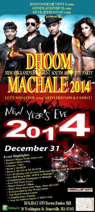 Boston's Biggest South Asian New Party. Dhoom Macahale! Please go to www.BostonDesiEvents.com to get your tickets. Don't miss out!! 2 rooms...3 hot dj's. Room 1: DJ Jay, Mayur playing Bollywood Bhangra Top 40. Room2: DJ Hem playing Bollywood, Nepalese, and today's top music. Dance party tix only $25. Dance Party starts at 10pm. Dinner & Dance only $40. Dinner buffet from 7pm to 10pm.