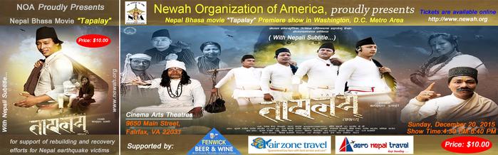 Newah Organization of America’s (NOA) would like to invite you to join us to watch a premiere show of the Nepal Bhasa movie “TAPALAY” with Nepali subtitle. The proceeds will be used to support rebuilding and recovery efforts for Nepal Earthquake victims.