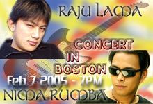 GBNC is proud to present two of the hottest personalities from the Nepalese pop scene, Nima Rumba and Raju Lama. Join us they entertain and brighten our Monday with their premier performance in the US. Look forward to an evening of great entertainment and fun. There will be music, dance, and singing aplenty! It's time to cast away those snow boots and... clear your throats, and dust off your dancing shoes. See you there! Place: VFW Mount Auburn Post 8818 Address: 688 Huron Ave, Cambridge, MA 02138 Day & Date: Monday, 7th February 2005 Time: 7 pm till 12 midnight Tickets: $20 (Advance) $25 (Door) PLEASE CONTACT THE FOLLOWING FOR TICKETS: Bhakta Gurung: 617 8184865 Binod Oli: 617 782 4925 Dinesh Sherchan: 617 2831915 Jangbu Sherpa: 347 6135886 Prem Tamang: 617 6272048 Surya Thapa: 617 5482219