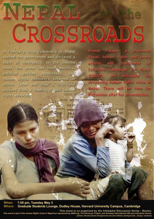 Chhalphal Discussion Series Where words matter! Title: Nepal at the crossroads Understanding the human rights situation in Nepal Speaker: Dinesh Prasain, Coordinator Collective Campaign for Peace (COCAP) Date: May 3, 2005 Time: 7 PM Location: Graduate Student Lounge, Dudley House, Harvard University, Cambridge, Massachusetts (Opposite Au Bon Pain, inside Harvard Yard)