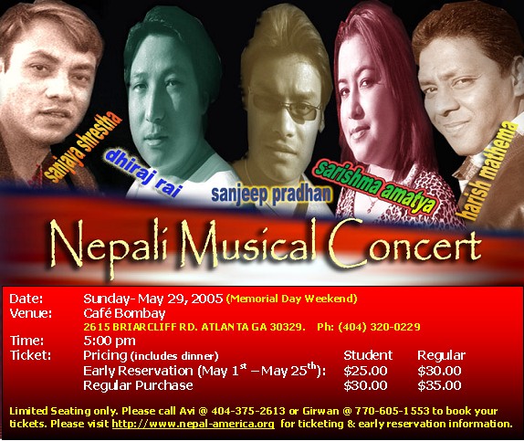 Please mark your calendar for May 29, 2005 Sunday. Do not miss your opportunity to see our Nepalese Artists perform. Let us show our support for these talented artists by attending the show. Snacks and dinner will also be served. Artists: Harish Mathema, Sanjay Shrestha, Sanjeev Pradhan, Dhiraj Rai and Sarishma Amatya. Venue: Atlanta GA, Date: May 29th, 2005
