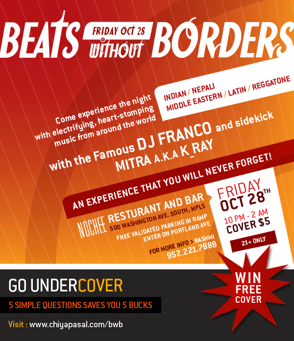 Beats without Borders Friday Oct 28th Nochee Resturant and Bar 500 Washington Ave. South, MPLS Come Experience the night with electrifying, heart-stomping music from around the world. Indian/Nepali/Middle Eastern/Latin/Reggatone With the Famous DJ FRANCO and sidekick MITRA a.k.a. K_RAY 10 PM - 2 PM Cover $5 21+ Only For More Info : Rashmi 952.221.7888 Official Beats Without Borders website + Chance to WIN FREE COVER http://www.chiyapasal.com/bwb