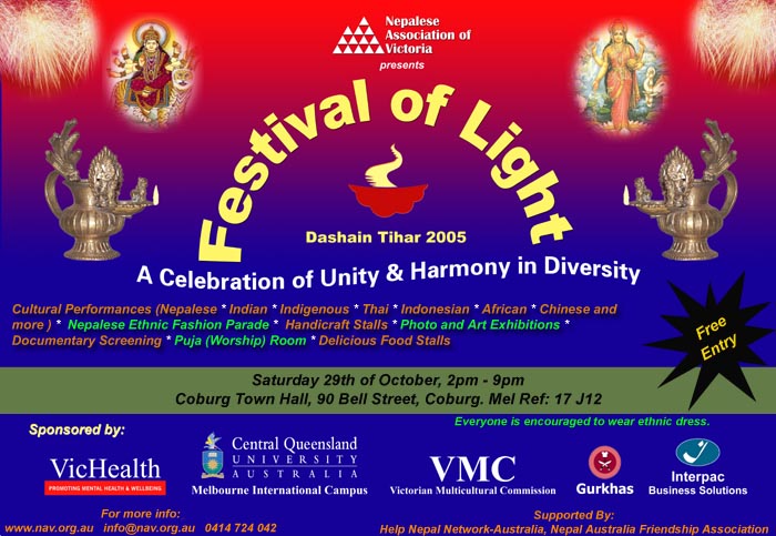 Nepalese Association of Victoria is organising a grand celebration of this year's Dashain and Tihar, with a day long festival celebration titled - 'A Festival of Light - A Celebration of Unity and Harmony in Diversity'. The highlight of the day will be a colourful and vibrant cultural extravaganza which will include performances by Nepalese artists and artists from other communities including Indigenous, Indonesian, African, Chinese, Indian, Thai communities etc. There will also be Nepalese ethnic fashion parade, delicious food stalls, handicraft stalls, photo and art exhibitions, information stalls and puja room (worship room). Date: Saturday 29th of October 2005 Time: 2pm - 9pm FREE ENTRY. Everyone is encouraged to wear ethnic dress. For more info, visit http://www.nav.org.au/ or ring 0414 724 042