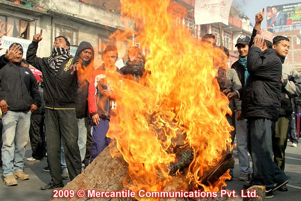Jado chha Nepal ma batomai ago balera bhaye ni ago tapao "It's cold in Nepal let's warm up ourself by buring tires and other stuffs on the road as there is no electricity." Why to care other disturbances causes by this action?? .... a picture from nepalnews.com