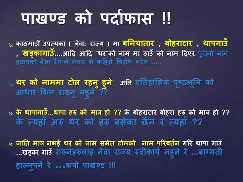 Sometime I feel like giving up the argument and let them change it to whatever the heck they want. Why stop at Newa? Let's rename upper patan as Bajracharya Gaun and middle Bhaktapur as Maharjan Tol. Naam rakhdaima afno pragati hunchha bhan thanya chhan ki ke ho?